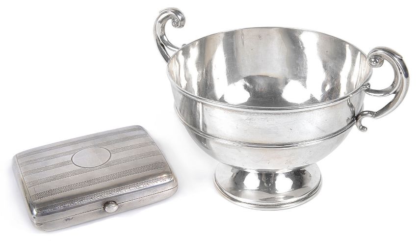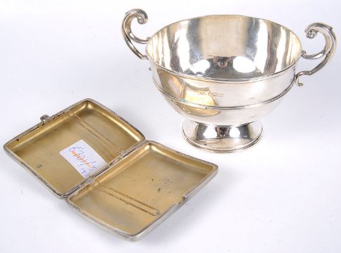 of circular form with a reeded girdle and scrolled flying handles, on pedestal foot, together with a George V silver curved hip cigarette case with engine turned decoration, Birmingham, 1913 by Deakin & Francis, gilt interior marked PATENT 8902 (2)