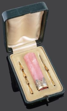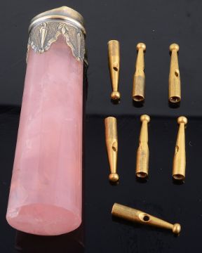 Fr. guarantee mark, foliate collar mount with shaped ribbon border, tapering rose quart handle, accompanied by seven gilt metal canopy stretcher tips, in original fitted morocco case