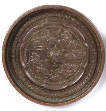 of circular form, the interior relief cast with a petal edge reserve depicting the setting sun, cranes and a pavilion with a terrapin to centre