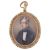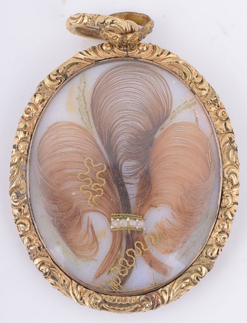 portrait miniature of a young gentleman wearing a black coat and a cravat, watercolour on ivory, oval, glazed, tests for gold foliate scroll carved frame with suspension ring, reverse glazed with three curled locks of hair with seed pearl and gold wire mounts against foil backed opaline glass
