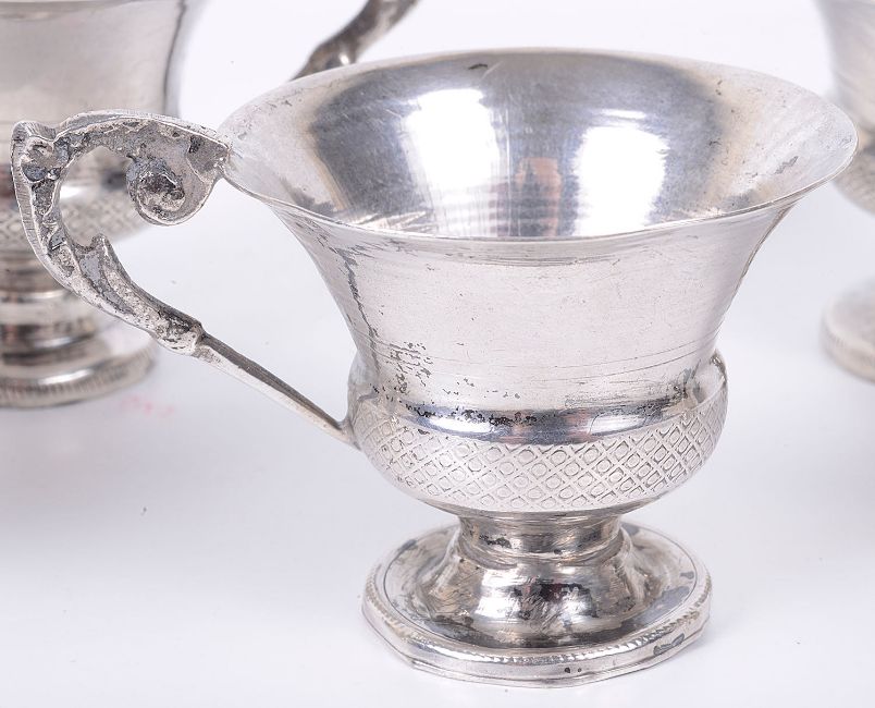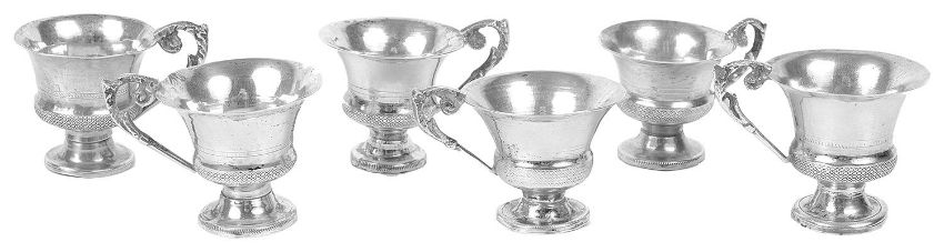 of campana form with flared on a pedestal foot, leaf scroll handle, gilt interior (6)