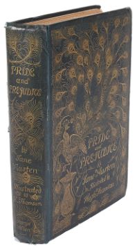 Austen, Jane. Pride and Prejudice, with a Preface by George Sainsbury and illustrations by Hugh Thomson. 1894, London, George Allen. b & w frontis., numerous b & w illustrations, 8vo., original pictorial dark green cloth decorated in gilt with a peacock design to front cover, spine gilt and decorated with peacock feathers, gilt top edge, pp.4768vo.Condition: Corners bumped, cloth split along hinge of spine to back board, front board hinge fraying, some discolouration to end papers, with contemporary and later owners inscription, contents cleanPlease note this lot is not subject to VAT