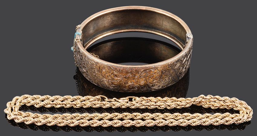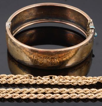 together with a scroll engraved yellow metal bangle (2)