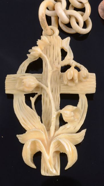 including two red coral single row necklaces, a red coral seed bead necklace, a coral bead comb top, coral studs and two angel skin coral necklaces, together with a Victorian carved ivory heart pendant, carved ivory rose brooch, floral cross on carved chain and other related items (qty)