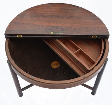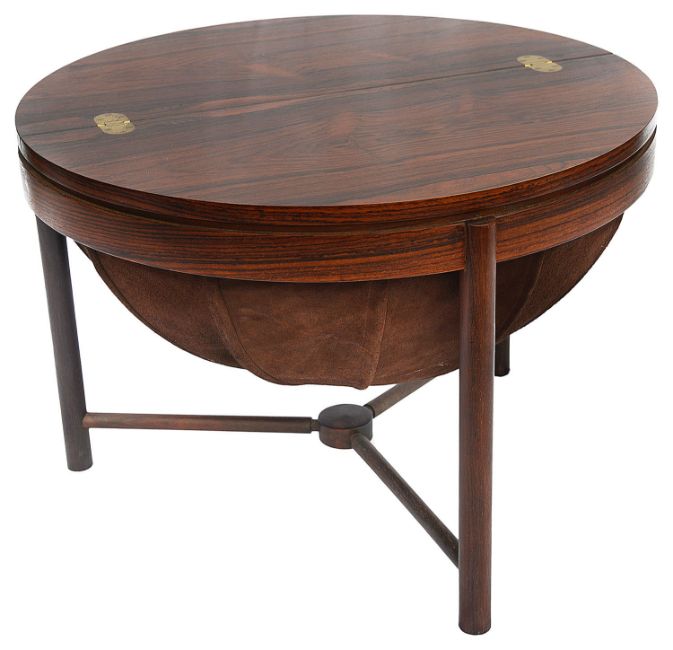 the foldover top with sunken brass hinges opening to reveal and interior fitted with a revolving demi lune shaped tray fitted with divisions, above a gathered brown suede bag, raised on three turned supports united by a stretcher, bears paper label. This design was awarded 1st Prize in the 1962 Norwegian Design Competition. Accompanied by the original Heals receipt