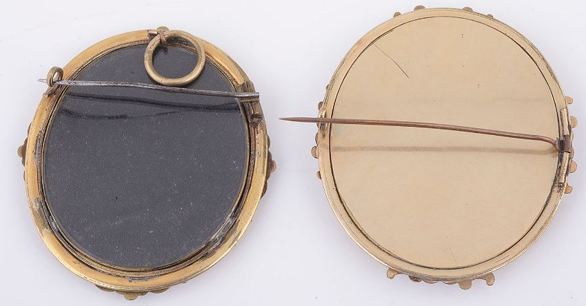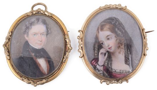 one of a young woman with parted brown hair and her right hand lifted to her face, wearing a black lace veil on her head and a scarlet lace edged dress, watercolour on ivory, oval pinchbeck glazed frame with scroll mounts closed back and brooch fitting, the other a portrait of a man with curly black hair wearing a black coat and tied black cravat, watercolour on ivory, oval, similar brooch frame with glazed compartment to reverse and suspension ring (2)