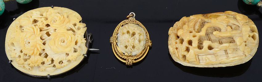 A small collection of Oriental jewellery including three carved Canton ivory brooches