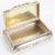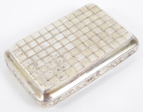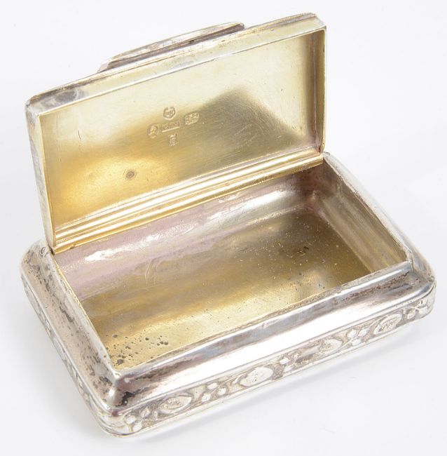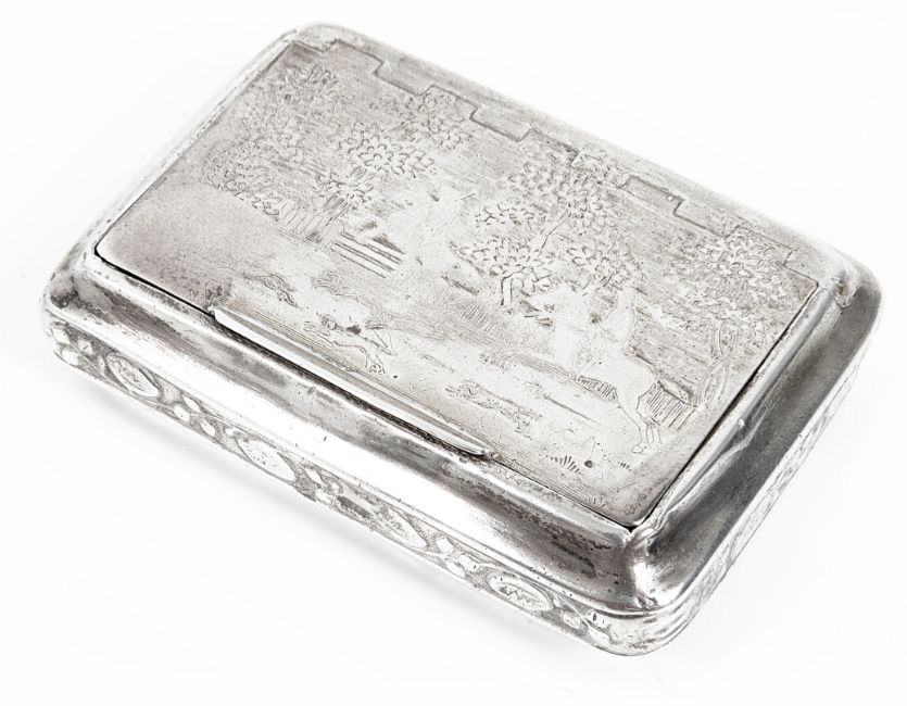 of rectangular form with concave moulded edge, the lid with sunken hinge and raised thumb piece engraved with a fox hunting scene, sides cast with scrolling foliate design, the base with basket weave, interior gilt