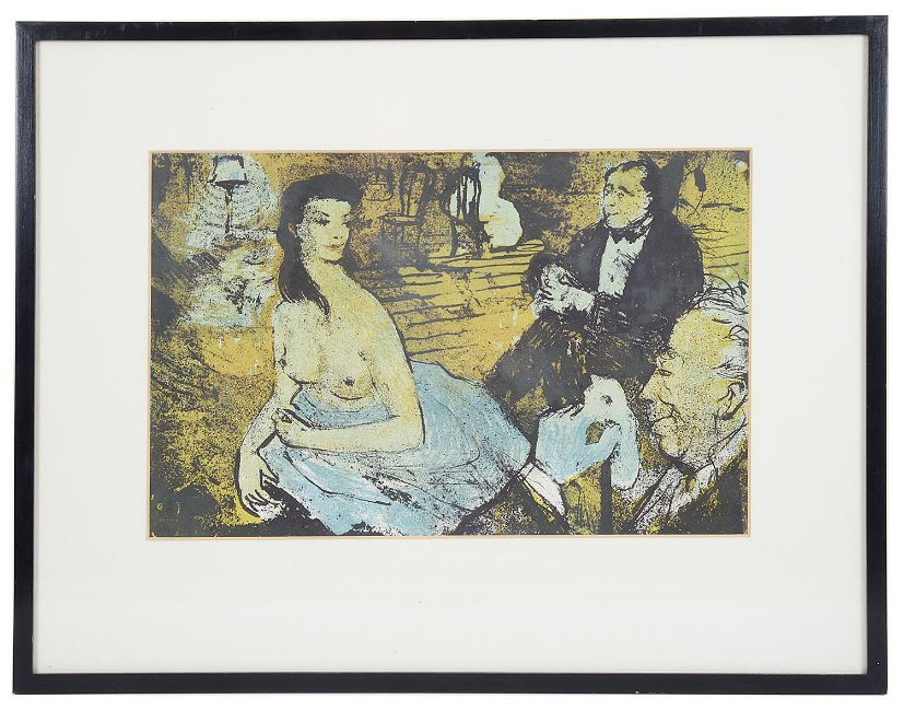 'A seated semi-nude woman being admired by seated gentlemen in evening dress', a silk screen, unsigned, mounted, framed