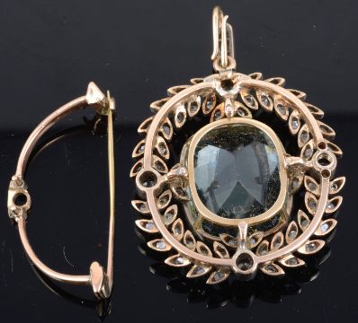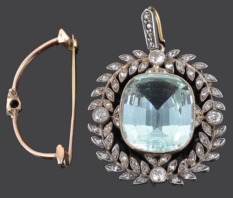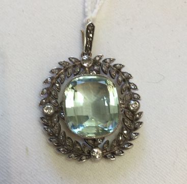 the cushion cut central tourmaline of pale green/blue colour and set within a quartered diamond and rose diamond set laurel leaf frame, rose diamond set suspension loop, side fitting brooch mount, tests for gold, associated box