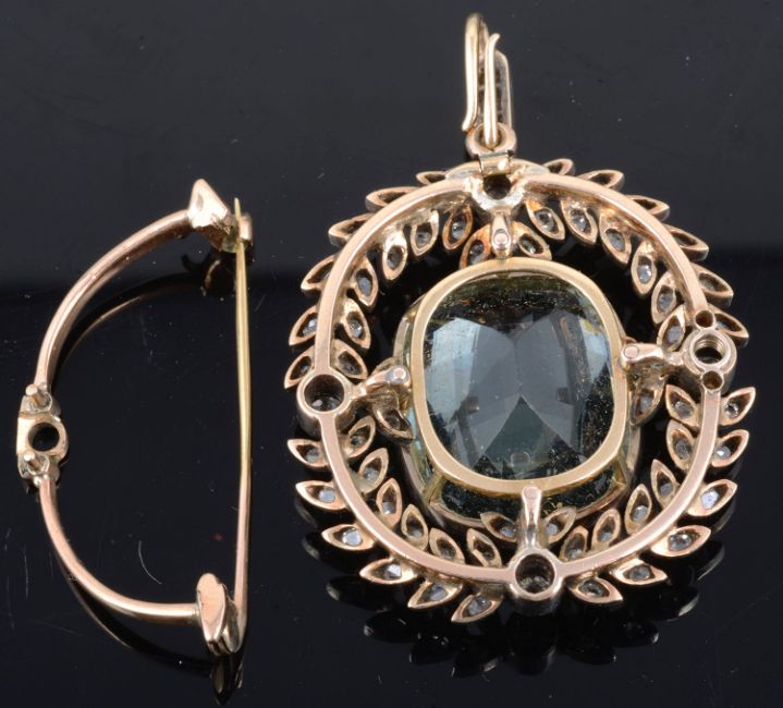 Condition: There has been some historic alteration or repair to the reverse of the pendant particularly below the suspension loop, only visible to the reverse, the brooch fitting secures sideways to the brooch and the suspension loop is removable allowing it to be worn sideways as a brooch, the fitting lacks its securing screw and there is a small crack to the hinge end of the fastening pin