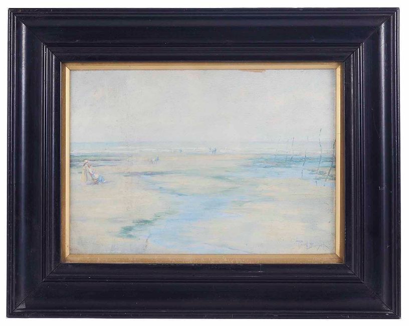 'Viewing the incoming tide', oil on board, signed lower right, mounted in a black frame