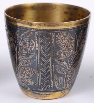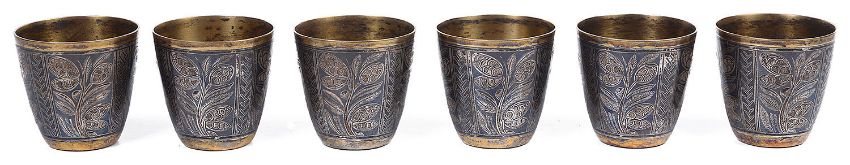 the tots of tapering form decorated in niello with a floral band, the circular tray with raised rim also with niello decoration (7)