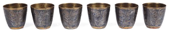 A contemporary set of six Russian .875 silver gilt and niello vodka tots with an associated tray