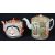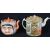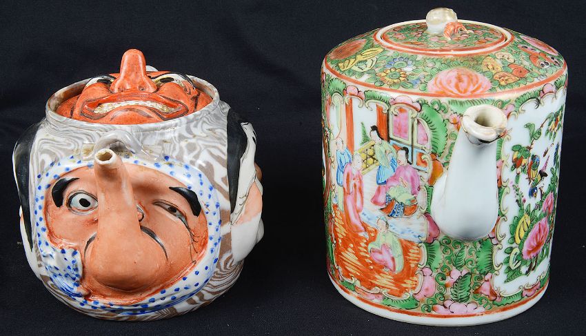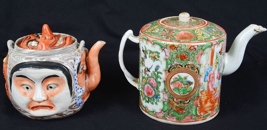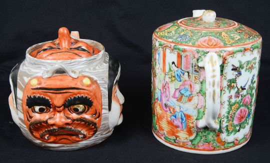 Condition: Mask teapot with absent handle, some wear to enamel. Canton teapot with old riveted repair to spout with a slight loss