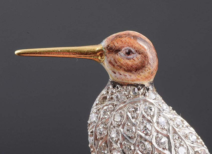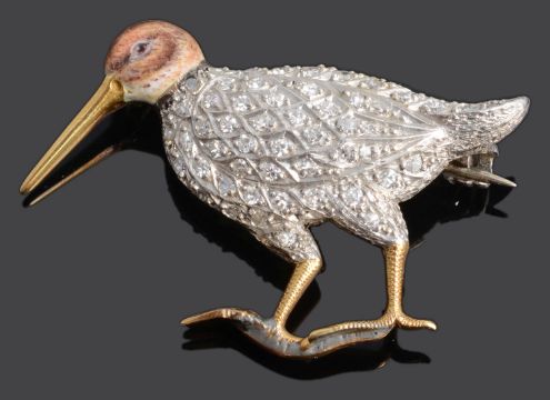 1920s, marked on the reverse platm and 18ct, the body of the bird inset with graduated diamonds and the head very finely painted, the beak and legs 18ct