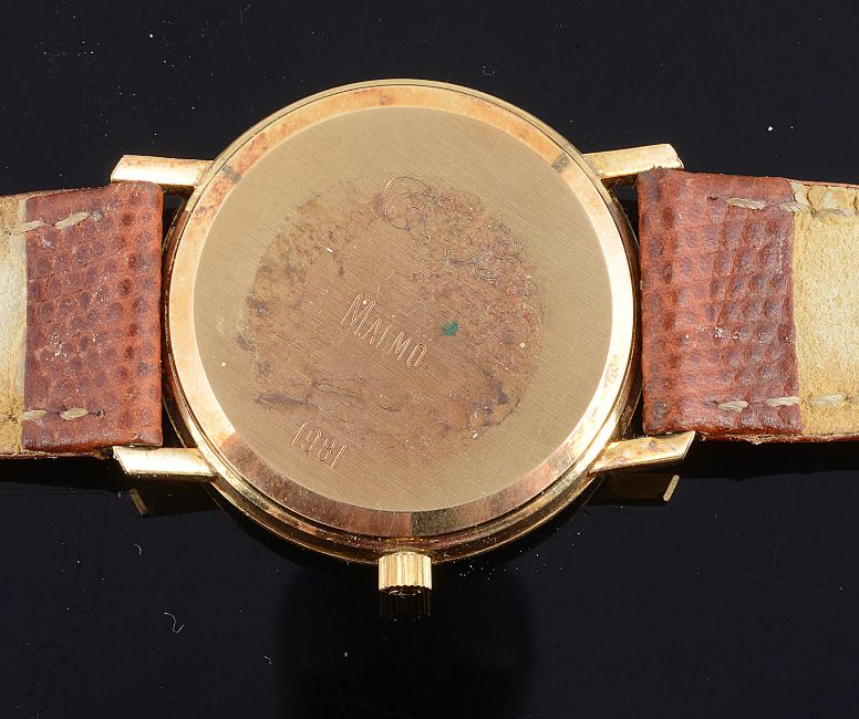 the circular textured silver dial having gold hour baton markers, calendar aperture, gold hands and sweep seconds hand, 17 jewel unadjusted movement, numbered 39095280, case back engraved Malmo 1981, on embossed leather bracelet with buckle fastener, Omega box