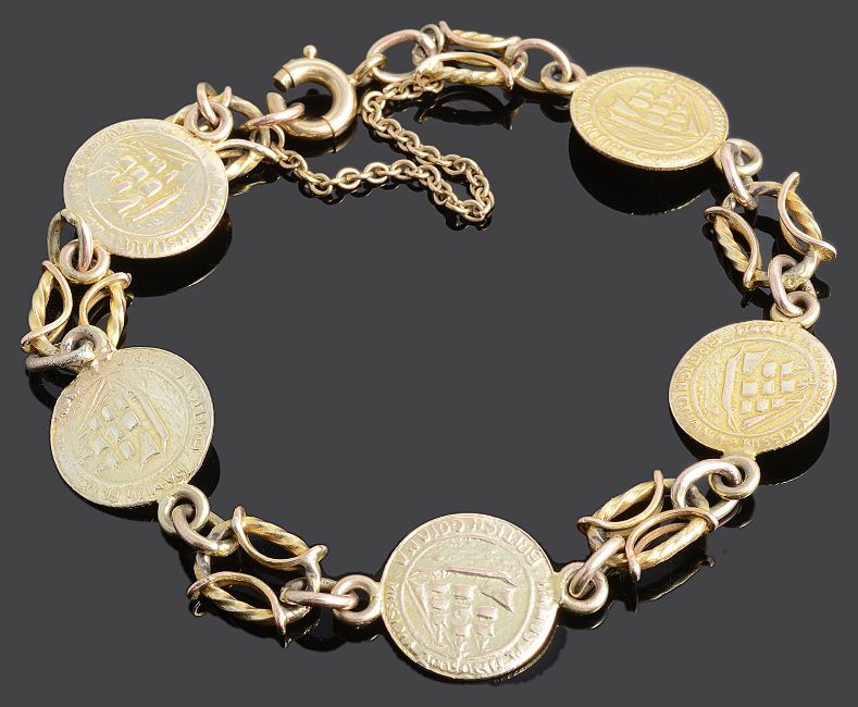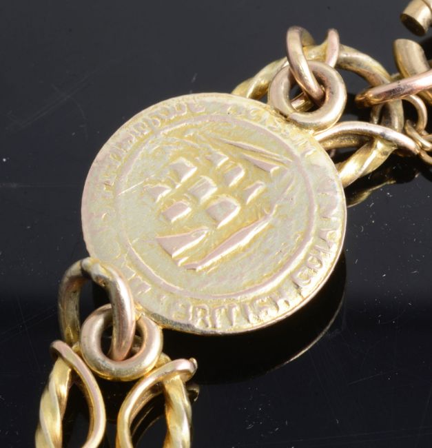 the coin discs with galleon decoration and each one stamped Brit. Guiana and separated by fancy rope twist links, tests for gold