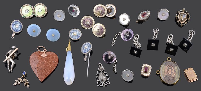 including two silver and rose diamond small pendants, a small jester figure, tests gold and silver, various Edwardian enamel and diamond set buttons, test gold, amethyst, rock crystal and agate buttons, rose diamond set hinged locket, Georgian gilt hair memorial clasp, goldstone heart pendant, tests gold, chalcedony and gilt drop pendant, Georgian garnet and half pearl clasp and another, both test gold, a delicate blue and white jasper ware rose diamond set triple 'daisy' brooch a.f (qty)