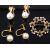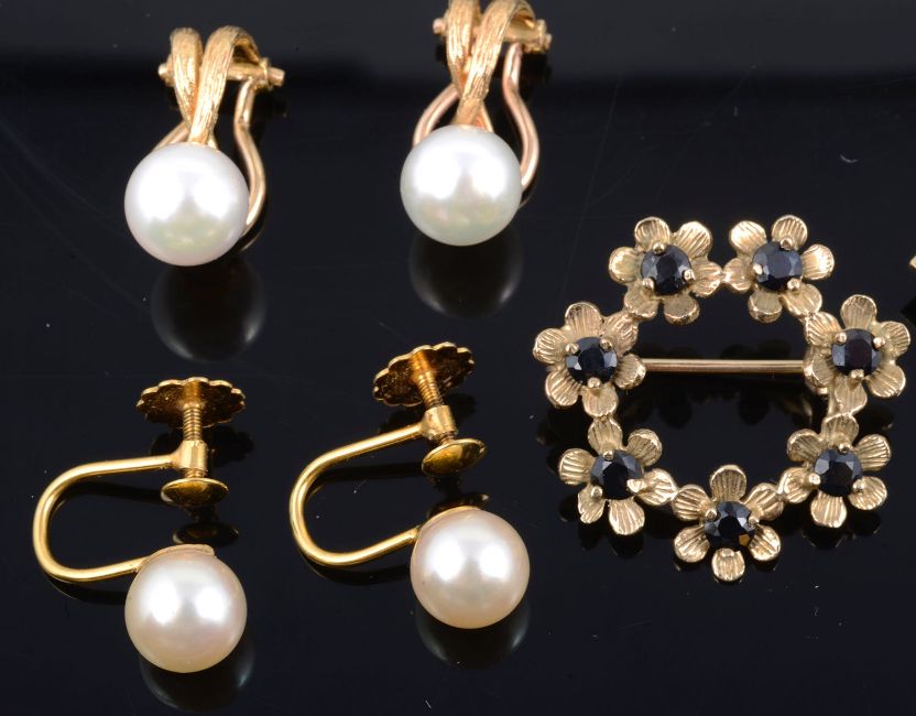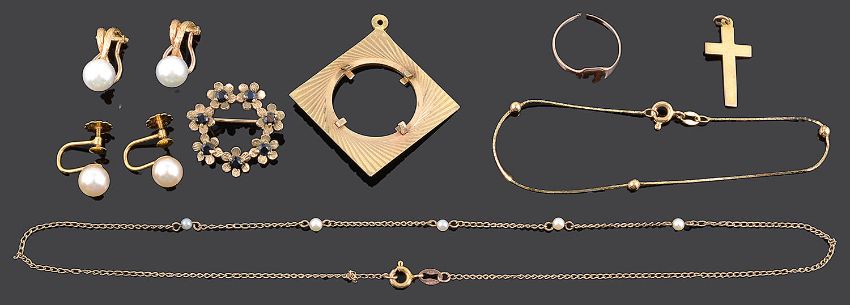 comprising a sapphire set flower wreath brooch, a square shaped coin pendant frame, a pendant cross, a fine curb link chain with simulated pearl beads, a fine articulated square section beaded chain bracelet, two pairs of cultured pearl stud earrings, one pair with clip backs the other with screw fittings and a rose gold signet ring, with associated boxes (8)