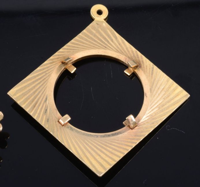 Condition: Coin pendant frame with one pin pulled back, slightly pushed at top by suspension loop, signet ring cut