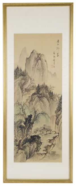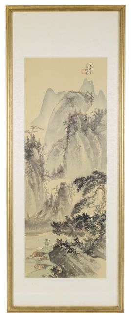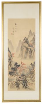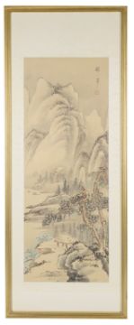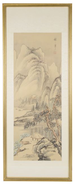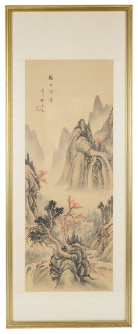 comprising a pair and two others depicting mountainous wooded landscapes, each with lines of calligraphy, and signed with red seal marks, mounted and framed