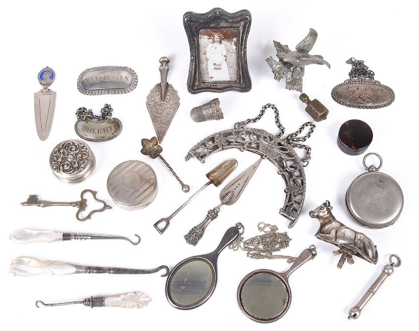 comprising a Dutch pierced silver purse frame, a twist action telescopic button hook with suspension ring, two circular rouge pots, three page markers, one novelty in form of a trowel with agate handle, a miniature easel back photograph frame, a 'Gin' bottle ticket and a watch case together with plated other items to include, two miniature hand mirror pendants, a miniature spade, mother of pearl handled button hooks etc (qty)