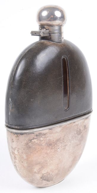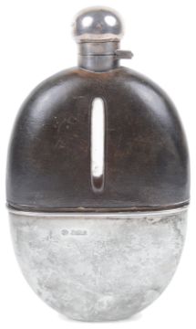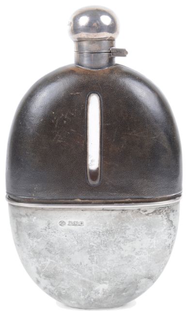 A George V large silver mounted oval glass and leather hip flask