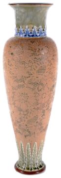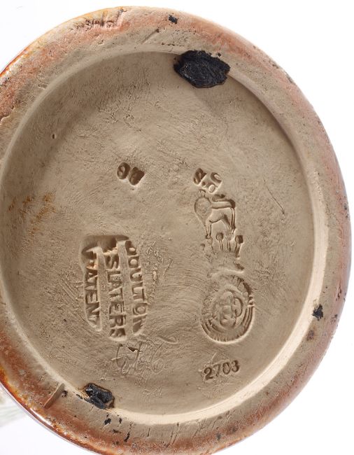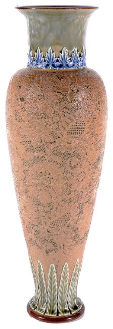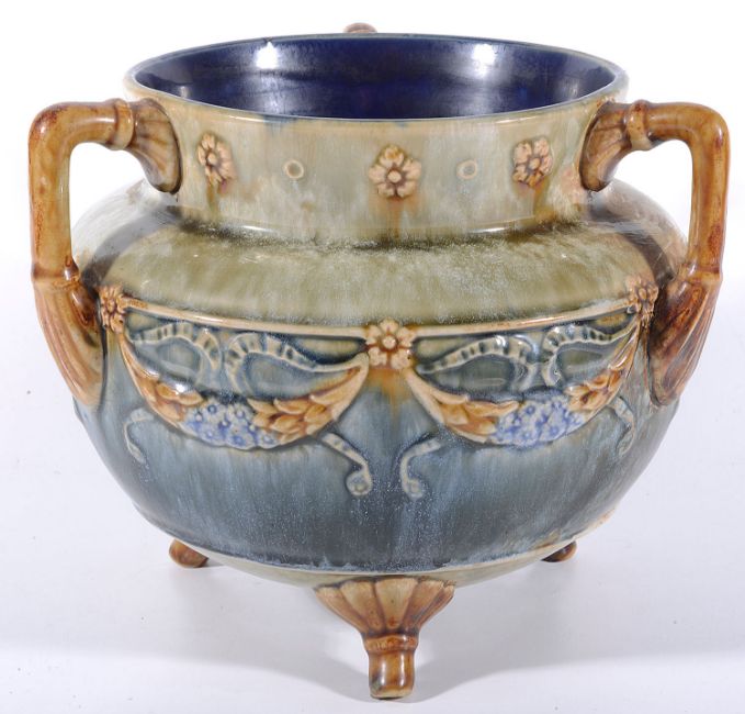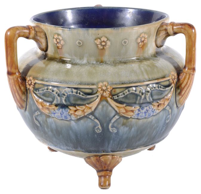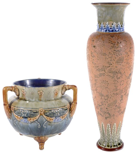 moulded with floral garlands, green blue streaky ground, raised on three feet , 6946, together with a Doulton Slaters Patent tall ovoid form vase with flared neck, the body decorated with floral lace pattern, stiff leaf border to foot, 2708, impressed marks (2)