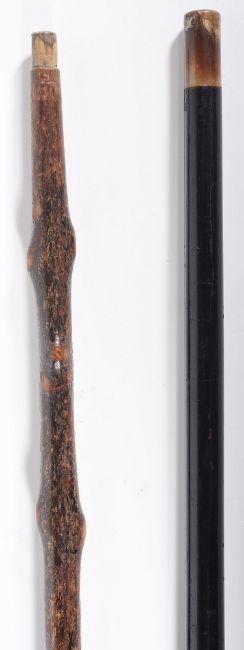having tapering horn grip and terminal, together with a late Victorian blackthorn shillelagh having a silver ferule with initialled shield plaque (2)