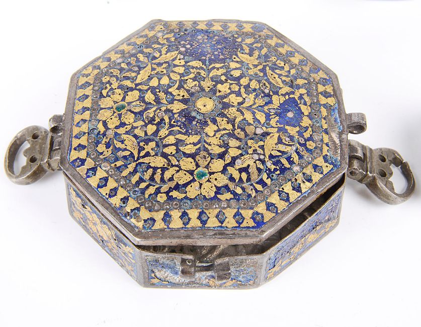 enamelled in blue and gold with a floral design, of octagonal form, the hinged domed over with swivel scroll lock, framed by twin hinged mounts, together with a silver oval Persian miniature Koran box, unmarked, engraved with Arabic calligraphy, two silver scroll charms,