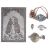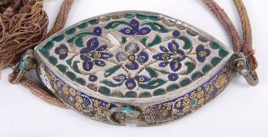 Condition: Koran box- areas of damage and loss to the enamel all over, pin for hinge absent, miniature Koran box - good condition, silver scroll charms - one possibly had a suspension loop, navette shaped - lacking cover, areas of damage and loss to enamel, bookplate - some wear to tin