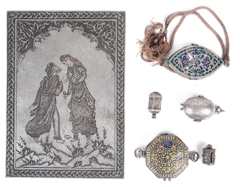 a navette shaped miniature enamelled silver Koran box, also unmarked, lacking cover, and a Persian tinned copped bookplate engraved with figures (5)