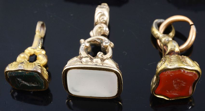 An interesting collection of Georgian and Victorian hard stone intaglio set and novelty fob seals