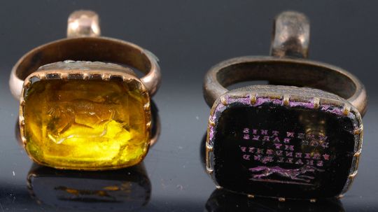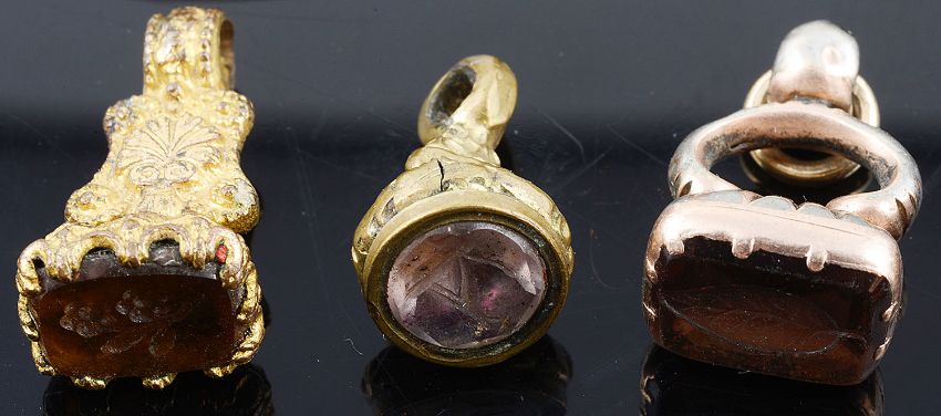 including several gold cased miniature hard stone intaglio seals, also Georgian and later gilt novelty seals such as a Georgian "Auld Lang Syne" seal, a 'When this dog shall bark, our friendship shall end" seal, a "Forget me Not" seal and more, together with a multiple spinning seal with messages including a ship on rough seas with caption "Such is Life", "We may be happy Yet" and "All's Well" , an interesting and varied collection (19)