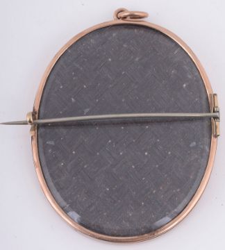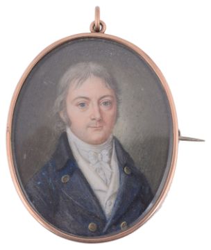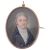 portrait miniature of a gentleman with grey hair, c.1800 wearing a blue coat and white waistcoat and cravat, watercolour on ivory, oval, tests for gold glazed brooch frame with suspension ring, plaited hair back