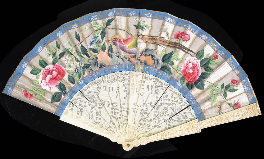 A mid 19th century large Chinese Canton ivory and painted paper fan