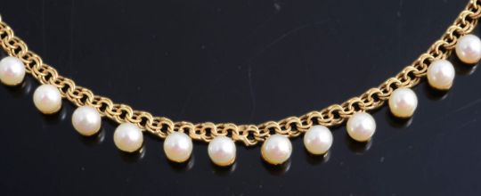 the 9ct gold neck chain suspended entirely with even size cultured pearls, stamped 9ct to clasp