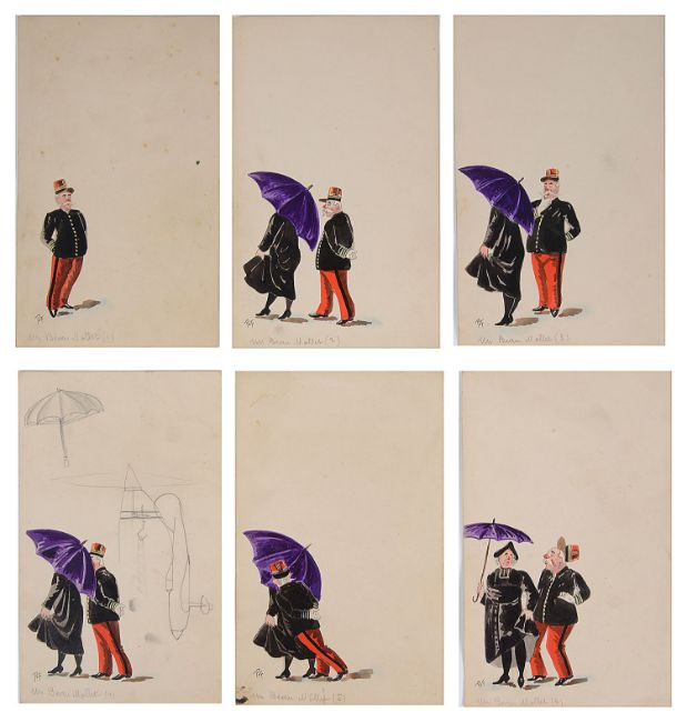 A humorous series of six early 20th century French illustrations, 'Un Beau Mollet'
