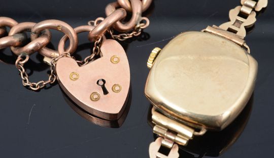 the bracelet having 9ct gold heart padlock fastening, together with a ladies 9ct gold cased Avia wristwatch on 9ct gold fancy bracelet (2)