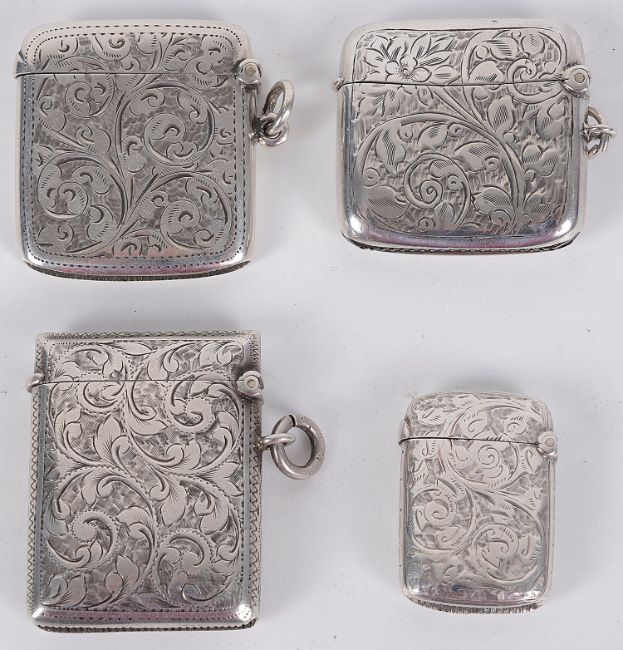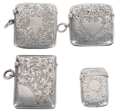 all of rectangular form and engrave with foliate decoration, three fitted with suspension rings, (4)