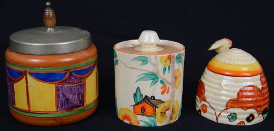 A Clarice Cliff Bizarre Farmhouse pattern beehive preserve jar and cover, black printed factory mark to base, together with an Original Bizarre preserve jar with plated cover and another cylindrical Clarice Cliff preserve jar and cover painted with a house and Rhodanthe flowers (3)