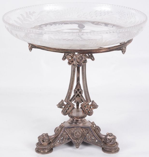 1872, the circular glass dish acid etched with ferns and other foliage on a Celtic design pedestal with triform base
