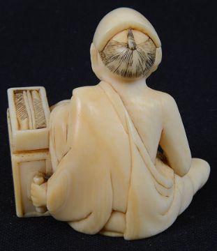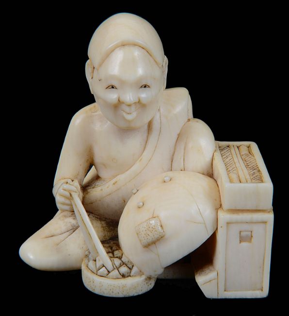 the netsuke in the form of a seated traveller with food box and chopsticks, character signature to base