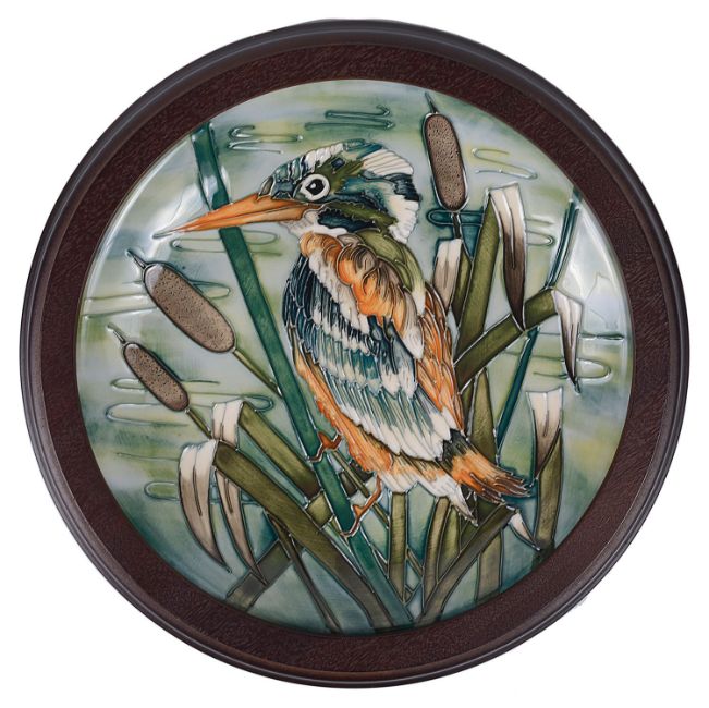 tube line decorated with a kingfisher and bullrushes, impressed marks, marked M.C.C. 97 in blue, framed