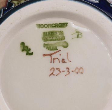 of waisted cylinder from, unadopted colourway, green impressed marks, marked Trial and dated 23-3-00 in brown