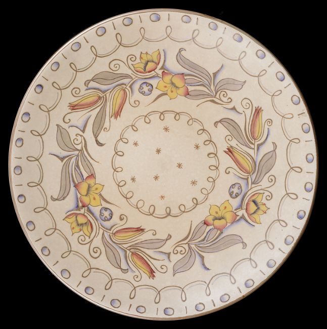 An Art Deco Bursley Ware Charlotte Rhead pottery charger, designed by Eddie Sambrook and decorated with a floral band between looped borders, pattern number TL95, blue printed factory mark to base, together with a Crown Ducal Charlotte Rhead pottery Persian Leaf pattern charger, pattern number 5623, green printed and tubelined factory marks to base