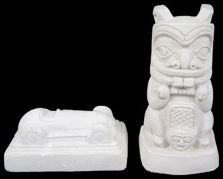Two plaster cast sculptures, 'Totem' and 'Racing Car', both unsigned, (2)