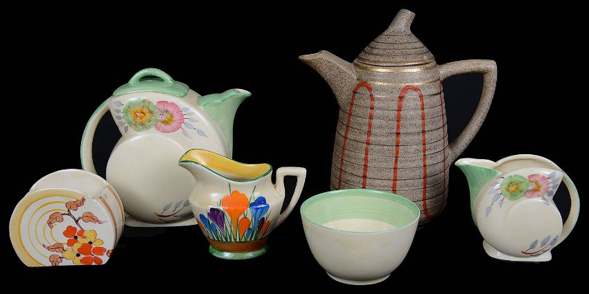 A Clarice Cliff Bizarre Lynton shape Goldstone coffee pot and cover, with red enamelled wavy decoration against a gilt banded ground, black printed factory marks to base, together with a Wilkinson Ltd Snail shape tea for one, painted with Aurea flowers, comprising a teapot and cover, milk jug and sugar bowl, an Autumn Crocus pattern cream jug and an Orange Hydrangea Bonjour shape sugar (6)