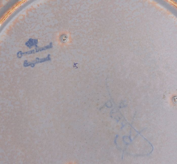 Four pieces of Art Deco Crown Ducal Charlotte Rhead Byzantine pattern pottery, comprising, a charger and vase in shades of pink and purple against a mottled buff ground, a green ground bowl and a mottled orange ground vase, various printed, painted and tubelined marks to bases (4)